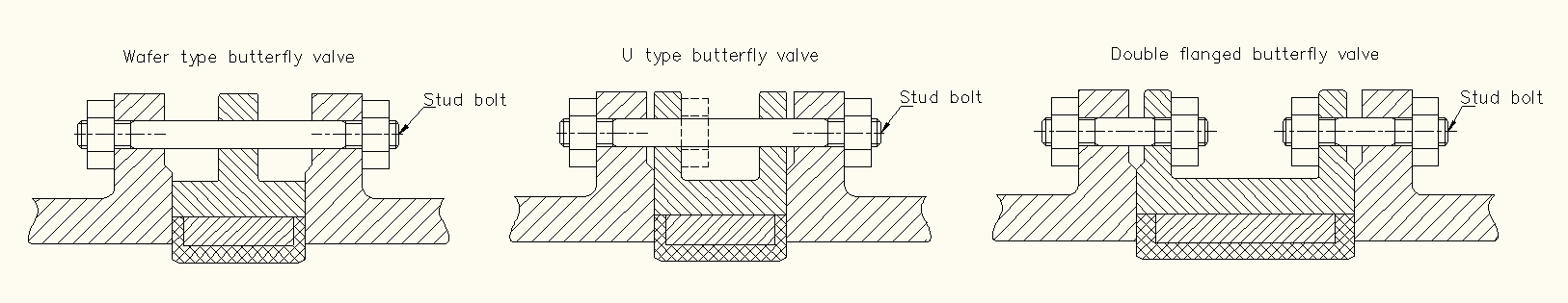 Aj keď sú na ventiloch dve integrované príruby, stále patria do kategórie doštičkového typu.Rovnaké rozmery priečnych konštrukcií ako priehľadný typ s kompaktným dizajnom, je umiestnený medzi dvoma prírubami, pričom čapy prechádzajú z jednej príruby cez druhú. Ventil je držaný na mieste a utesnený tesnením napätím čapov. Odolný klapkový ventil typu U je ľahké, bezúdržbové, nákladovo efektívne a spoľahlivé riešenie pre rôzne aplikácie.